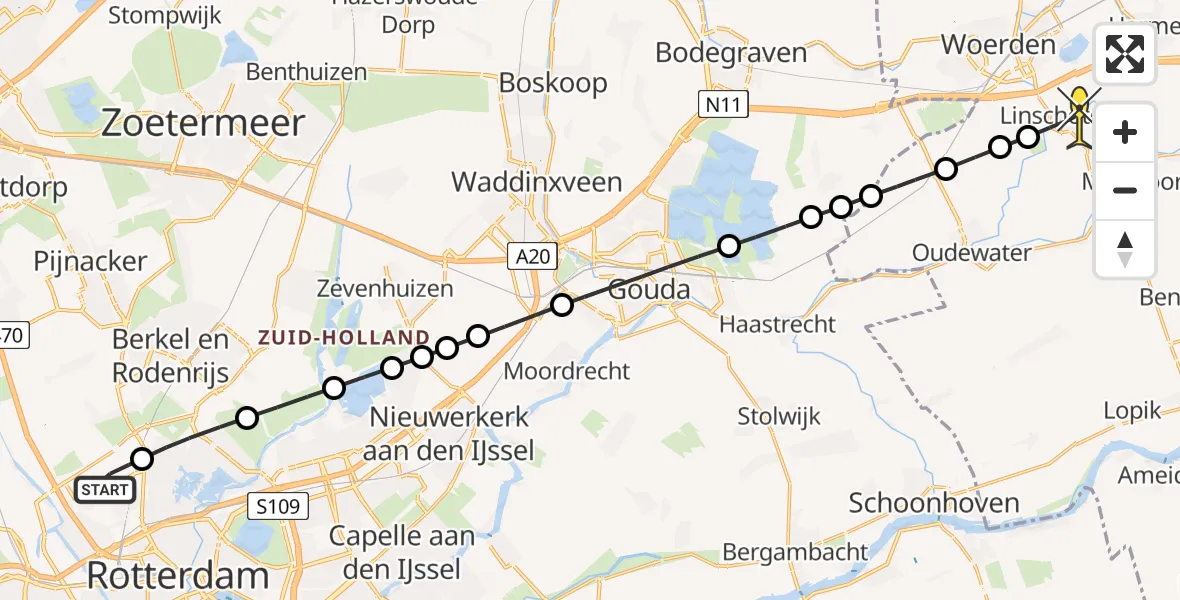 Op woensdag 19 maart 2025 om 9:18 is er een Traumahelikopter vertrokken van Rotterdam The Hague Airport naar Linschoten. Het gaat om de Traumahelikopter met registratienummer PH-UMC. De vlucht duurde 13 minuten. Het toestel heeft in die periode 36 kilometer afgelegd met een gemiddelde snelheid van 173 kilometer per uur op een maximale vlieghoogte van 130 meter.
