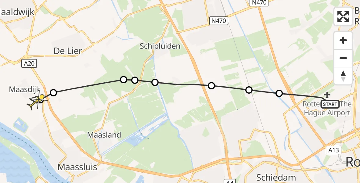 Op dinsdag 8 april 2025 om 12:52 is er een Traumahelikopter vertrokken van Rotterdam The Hague Airport naar Maasdijk. Het gaat om de Traumahelikopter met registratienummer PH-UMC. De vlucht duurde 8 minuten. Het toestel heeft in die periode 16 kilometer afgelegd met een gemiddelde snelheid van 128 kilometer per uur op een maximale vlieghoogte van 145 meter.