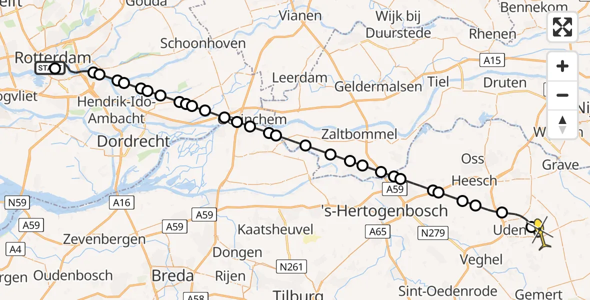 Op maandag 14 april 2025 om 1:04 is er een Traumahelikopter vertrokken van Erasmus MC naar Vliegbasis Volkel. Het gaat om de Traumahelikopter met registratienummer PH-TTR. De vlucht duurde 23 minuten. Het toestel heeft in die periode 92 kilometer afgelegd met een gemiddelde snelheid van 242 kilometer per uur op een maximale vlieghoogte van 427 meter.