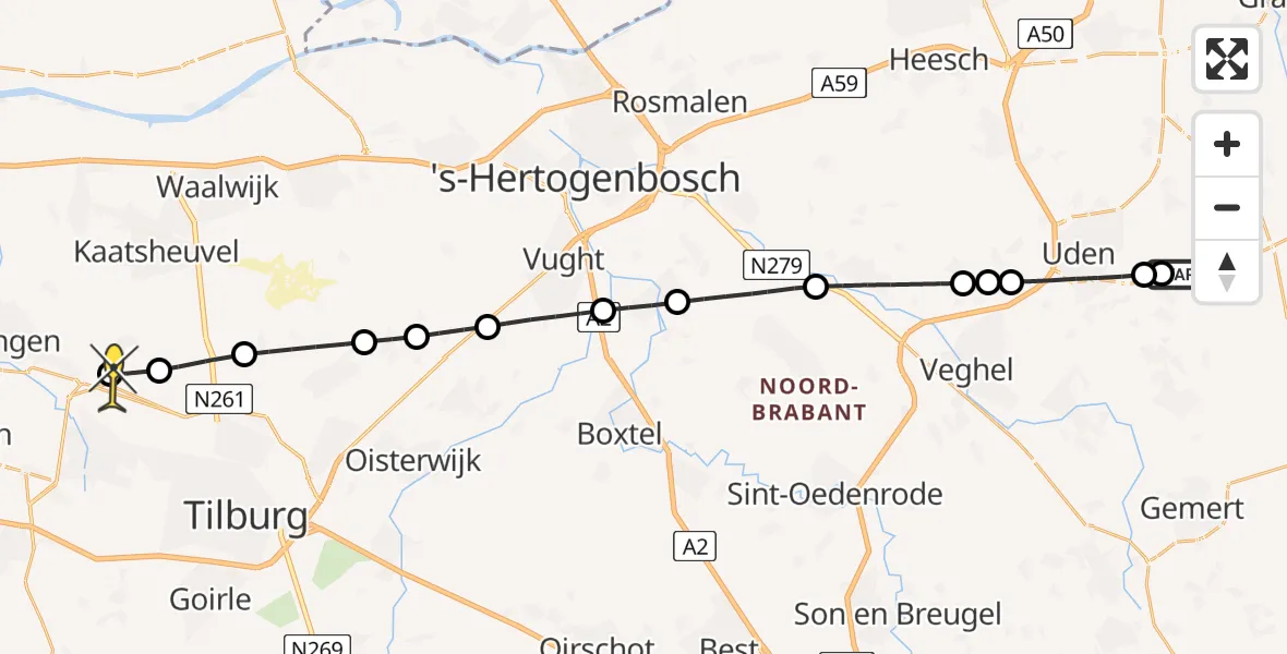 Op donderdag 17 april 2025 om 14:58 is er een Traumahelikopter vertrokken van Vliegbasis Volkel naar De Moer. Het gaat om de Traumahelikopter met registratienummer PH-TTR. De vlucht duurde 12 minuten. Het toestel heeft in die periode 48 kilometer afgelegd met een gemiddelde snelheid van 236 kilometer per uur op een maximale vlieghoogte van 168 meter.