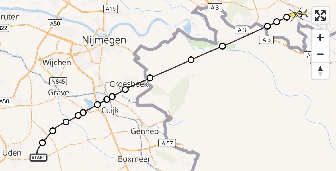 Op dinsdag 22 april 2025 om 14:35 is er een Traumahelikopter vertrokken van Vliegbasis Volkel naar Ulft. Het gaat om de Traumahelikopter met registratienummer PH-TTR. De vlucht duurde 15 minuten. Het toestel heeft in die periode 57 kilometer afgelegd met een gemiddelde snelheid van 223 kilometer per uur op een maximale vlieghoogte van 274 meter.
