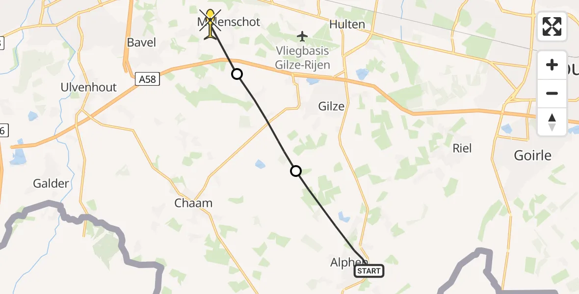 Op zondag 27 april 2025 om 15:39 is er een Traumahelikopter vertrokken van Alphen naar Molenschot. Het gaat om de Traumahelikopter met registratienummer PH-TTR. De vlucht duurde 4 minuten. Het toestel heeft in die periode 12 kilometer afgelegd met een gemiddelde snelheid van 184 kilometer per uur op een maximale vlieghoogte van 91 meter.