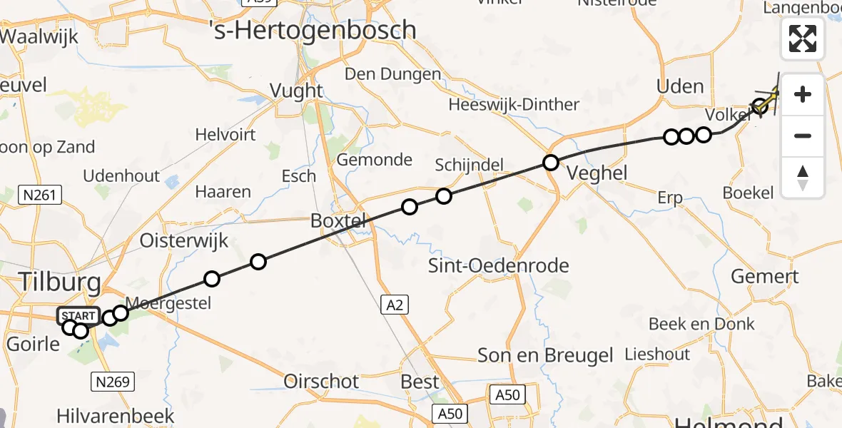 Op zaterdag 3 mei 2025 om 17:34 is er een Traumahelikopter vertrokken van Tilburg naar Vliegbasis Volkel. Het gaat om de Traumahelikopter met registratienummer PH-TTR. De vlucht duurde 15 minuten. Het toestel heeft in die periode 45 kilometer afgelegd met een gemiddelde snelheid van 184 kilometer per uur op een maximale vlieghoogte van 366 meter.