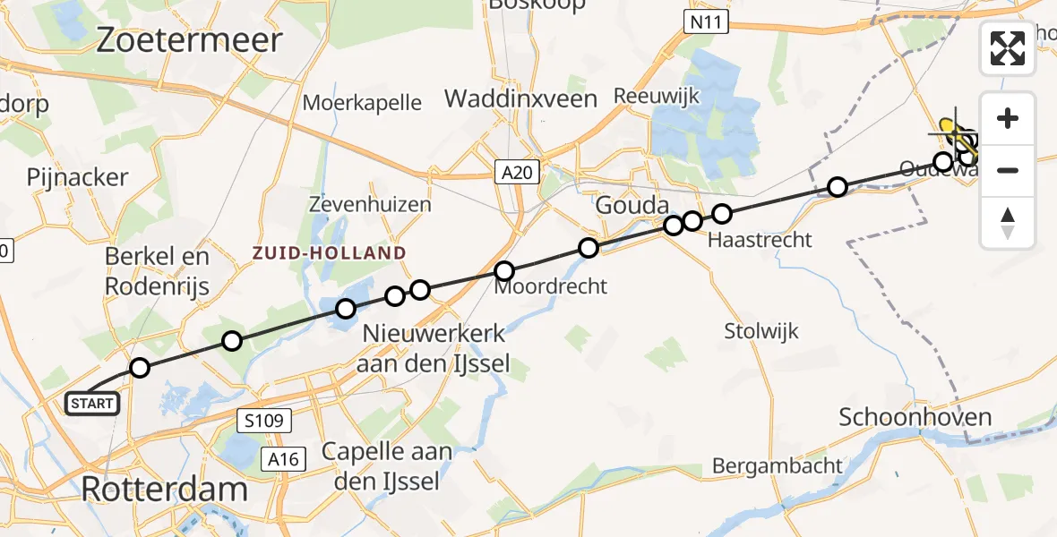 Op zondag 4 mei 2025 om 20:46 is er een Traumahelikopter vertrokken van Rotterdam The Hague Airport naar Oudewater. Het gaat om de Traumahelikopter met registratienummer PH-UMC. De vlucht duurde 11 minuten. Het toestel heeft in die periode 33 kilometer afgelegd met een gemiddelde snelheid van 182 kilometer per uur op een maximale vlieghoogte van 290 meter.