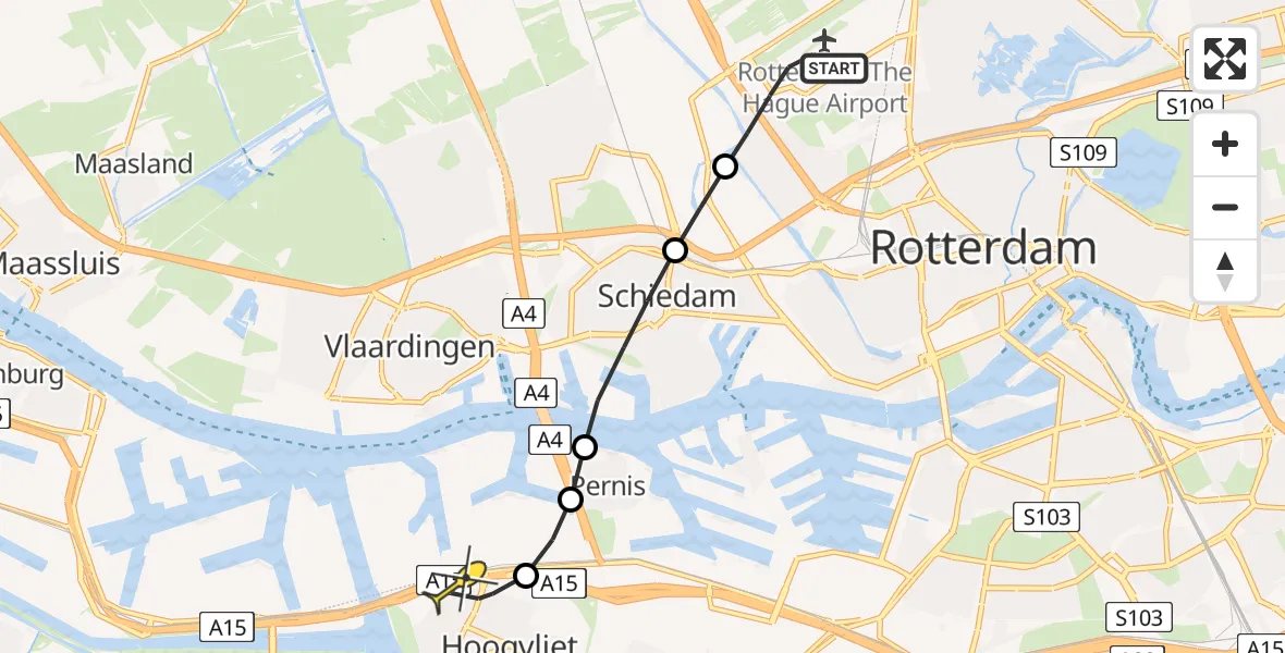 Op vrijdag 9 mei 2025 om 4:44 is er een Traumahelikopter vertrokken van Rotterdam The Hague Airport naar Hoogvliet. Het gaat om de Traumahelikopter met registratienummer PH-UMC. De vlucht duurde 5 minuten. Het toestel heeft in die periode 12 kilometer afgelegd met een gemiddelde snelheid van 135 kilometer per uur op een maximale vlieghoogte van 267 meter.