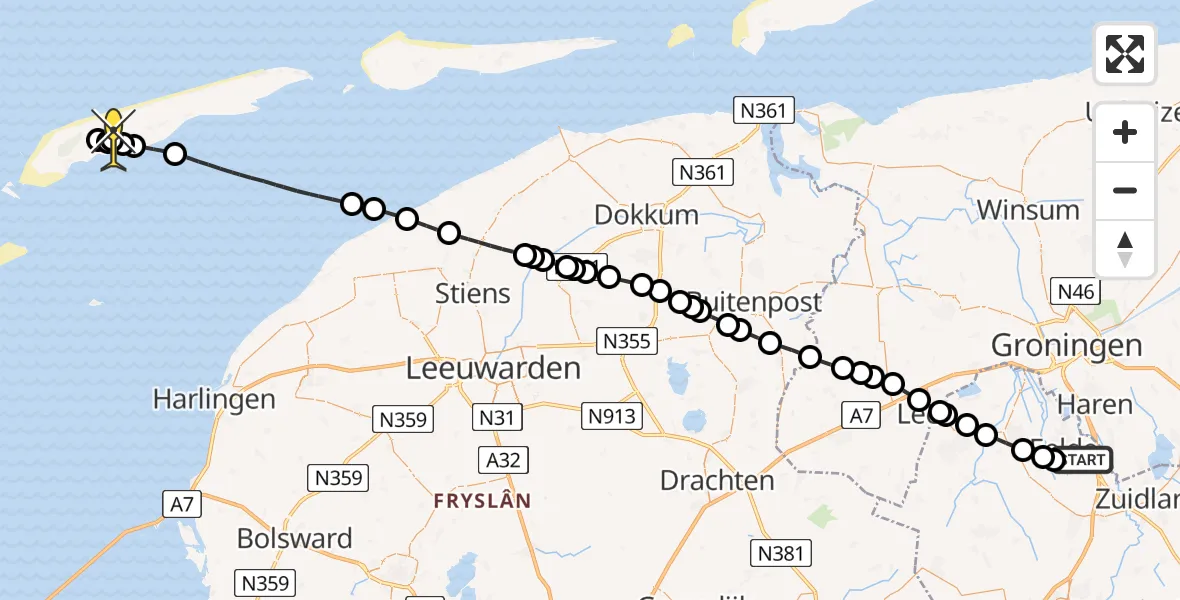 Op vrijdag 9 mei 2025 om 10:44 is er een Traumahelikopter vertrokken van Groningen Airport Eelde naar Midsland. Het gaat om de Traumahelikopter met registratienummer PH-HVB. De vlucht duurde 26 minuten. Het toestel heeft in die periode 95 kilometer afgelegd met een gemiddelde snelheid van 223 kilometer per uur op een maximale vlieghoogte van 137 meter.