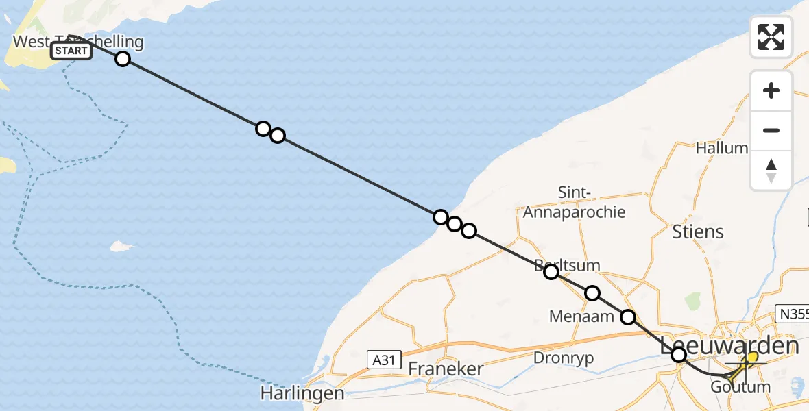 Op vrijdag 9 mei 2025 om 16:46 is er een Ambulancehelikopter vertrokken van West-Terschelling naar Leeuwarden. Het gaat om de Ambulancehelikopter met registratienummer PH-HOW. De vlucht duurde 15 minuten. Het toestel heeft in die periode 46 kilometer afgelegd met een gemiddelde snelheid van 187 kilometer per uur op een maximale vlieghoogte van 305 meter.