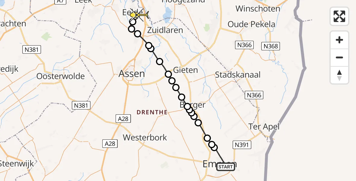 Op zaterdag 10 mei 2025 om 0:42 is er een Traumahelikopter vertrokken van Emmen naar Groningen Airport Eelde. Het gaat om de Traumahelikopter met registratienummer PH-HVB. De vlucht duurde 15 minuten. Het toestel heeft in die periode 47 kilometer afgelegd met een gemiddelde snelheid van 190 kilometer per uur op een maximale vlieghoogte van 335 meter.