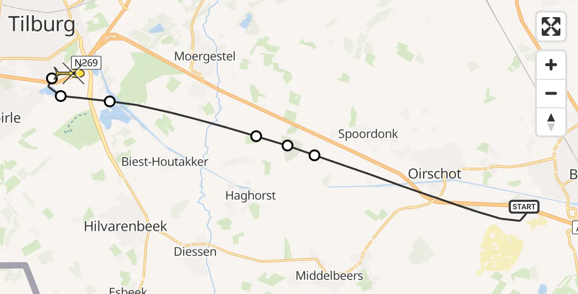Op maandag 12 mei 2025 om 23:15 is er een Traumahelikopter vertrokken van Oirschot naar Tilburg. Het gaat om de Traumahelikopter met registratienummer PH-UMC. De vlucht duurde 8 minuten. Het toestel heeft in die periode 21 kilometer afgelegd met een gemiddelde snelheid van 155 kilometer per uur op een maximale vlieghoogte van 312 meter.