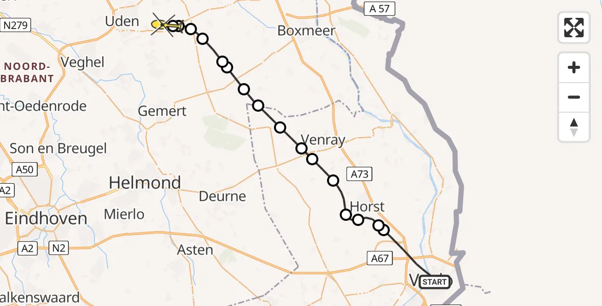 Op donderdag 15 mei 2025 om 1:45 is er een Traumahelikopter vertrokken van Venlo naar Vliegbasis Volkel. Het gaat om de Traumahelikopter met registratienummer PH-LLN. De vlucht duurde 14 minuten. Het toestel heeft in die periode 48 kilometer afgelegd met een gemiddelde snelheid van 206 kilometer per uur op een maximale vlieghoogte van 411 meter.
