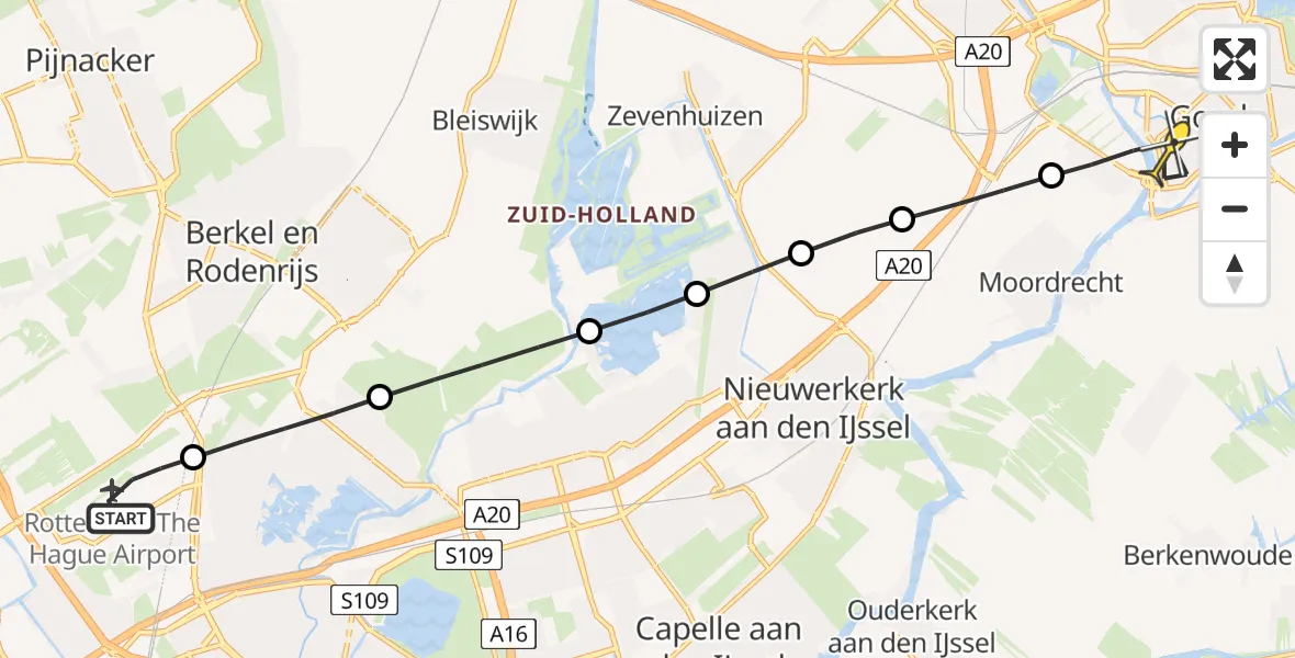 Op donderdag 15 mei 2025 om 5:50 is er een Traumahelikopter vertrokken van Rotterdam The Hague Airport naar Gouda. Het gaat om de Traumahelikopter met registratienummer PH-UMC. De vlucht duurde 10 minuten. Het toestel heeft in die periode 21 kilometer afgelegd met een gemiddelde snelheid van 122 kilometer per uur op een maximale vlieghoogte van 251 meter.