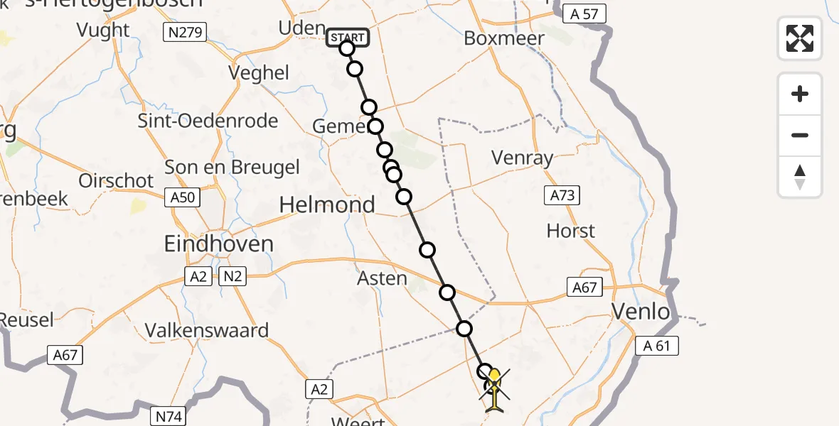 Op woensdag 21 mei 2025 om 18:16 is er een Traumahelikopter vertrokken van Vliegbasis Volkel naar Roggel. Het gaat om de Traumahelikopter met registratienummer PH-LLN. De vlucht duurde 11 minuten. Het toestel heeft in die periode 44 kilometer afgelegd met een gemiddelde snelheid van 238 kilometer per uur op een maximale vlieghoogte van 320 meter.
