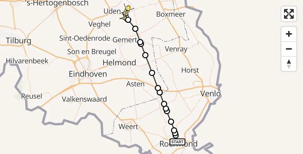 Op woensdag 21 mei 2025 om 19:18 is er een Traumahelikopter vertrokken van Roermond naar Vliegbasis Volkel. Het gaat om de Traumahelikopter met registratienummer PH-LLN. De vlucht duurde 16 minuten. Het toestel heeft in die periode 54 kilometer afgelegd met een gemiddelde snelheid van 199 kilometer per uur op een maximale vlieghoogte van 305 meter.
