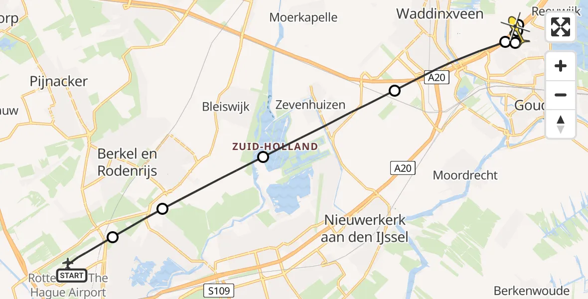Op woensdag 21 mei 2025 om 20:48 is er een Traumahelikopter vertrokken van Rotterdam The Hague Airport naar Waddinxveen. Het gaat om de Traumahelikopter met registratienummer PH-UMC. De vlucht duurde 9 minuten. Het toestel heeft in die periode 22 kilometer afgelegd met een gemiddelde snelheid van 154 kilometer per uur op een maximale vlieghoogte van 305 meter.