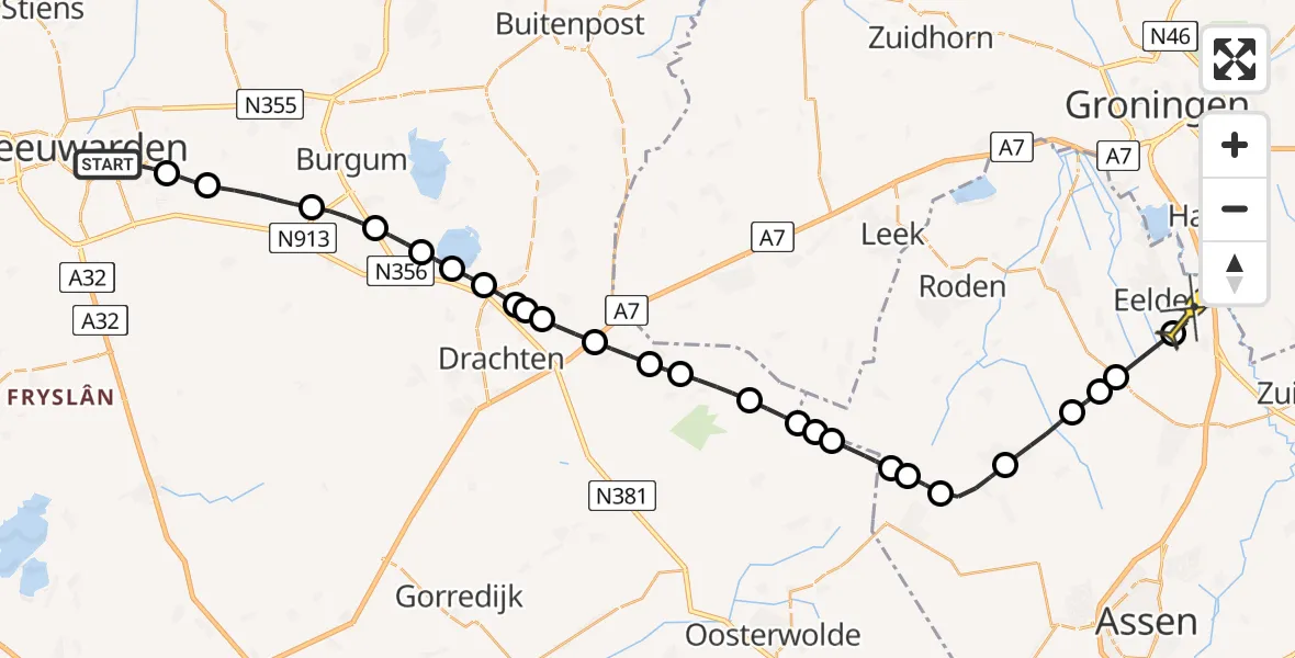 Op donderdag 12 juni 2025 om 18:45 is er een Traumahelikopter vertrokken van Leeuwarden naar Groningen Airport Eelde. Het gaat om de Traumahelikopter met registratienummer PH-MAA. De vlucht duurde 20 minuten. Het toestel heeft in die periode 59 kilometer afgelegd met een gemiddelde snelheid van 179 kilometer per uur op een maximale vlieghoogte van 892 meter.