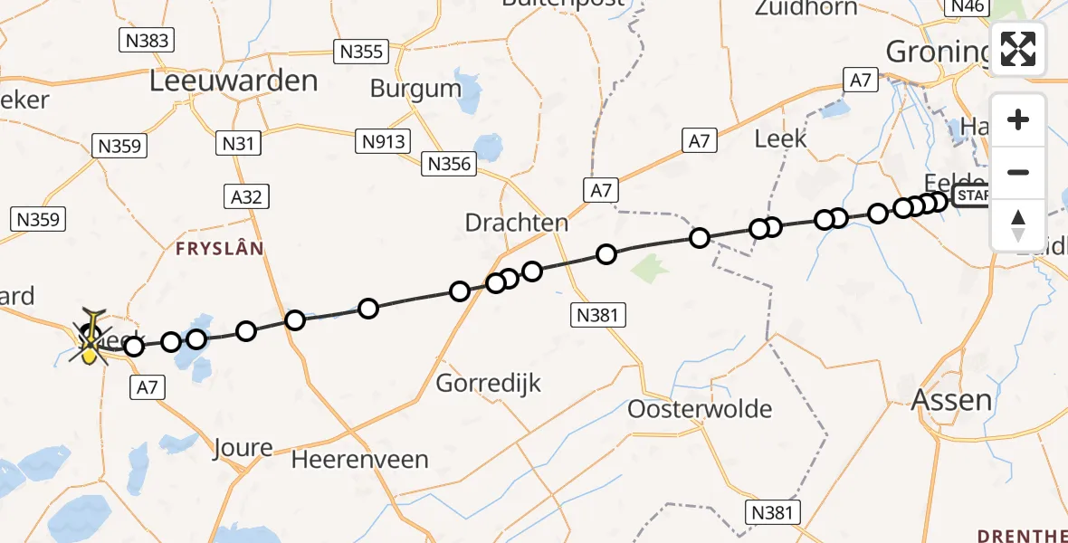Op zaterdag 14 juni 2025 om 22:30 is er een Traumahelikopter vertrokken van Groningen Airport Eelde naar Sneek. Het gaat om de Traumahelikopter met registratienummer PH-MAA. De vlucht duurde 20 minuten. Het toestel heeft in die periode 66 kilometer afgelegd met een gemiddelde snelheid van 194 kilometer per uur op een maximale vlieghoogte van 312 meter.