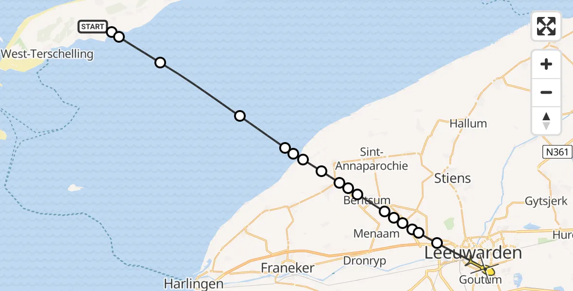 Op vrijdag 20 juni 2025 om 1:22 is er een Ambulancehelikopter vertrokken van Midsland naar Leeuwarden. Het gaat om de Ambulancehelikopter met registratienummer PH-HOW. De vlucht duurde 13 minuten. Het toestel heeft in die periode 41 kilometer afgelegd met een gemiddelde snelheid van 186 kilometer per uur op een maximale vlieghoogte van 206 meter.