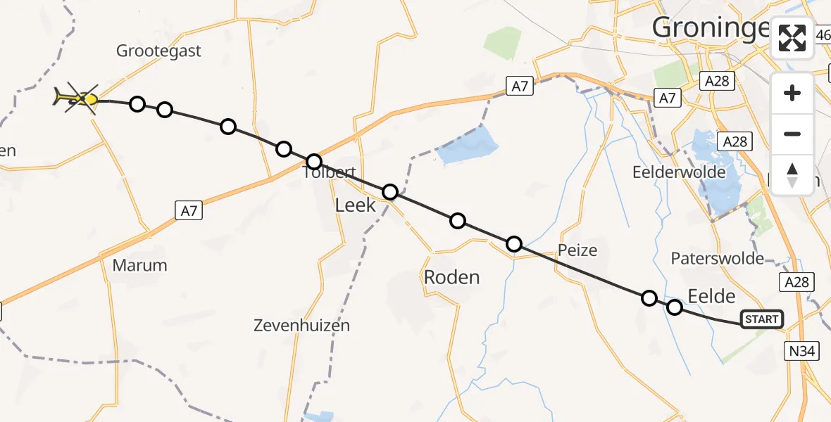 Op zaterdag 21 juni 2025 om 9:17 is er een Traumahelikopter vertrokken van Groningen Airport Eelde naar Doezum. Het gaat om de Traumahelikopter met registratienummer PH-MAA. De vlucht duurde 8 minuten. Het toestel heeft in die periode 26 kilometer afgelegd met een gemiddelde snelheid van 208 kilometer per uur op een maximale vlieghoogte van 137 meter.