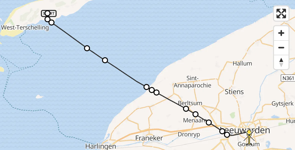 Op zondag 22 juni 2025 om 14:18 is er een Ambulancehelikopter vertrokken van Midsland naar Leeuwarden. Het gaat om de Ambulancehelikopter met registratienummer PH-OOP. De vlucht duurde 14 minuten. Het toestel heeft in die periode 43 kilometer afgelegd met een gemiddelde snelheid van 181 kilometer per uur op een maximale vlieghoogte van 312 meter.