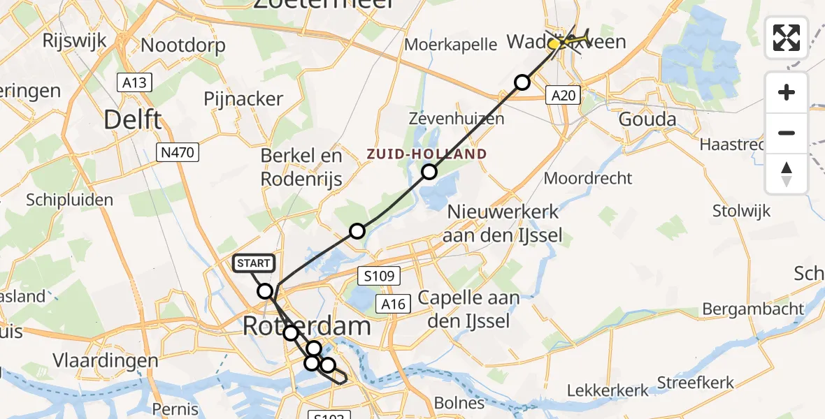 Op dinsdag 24 juni 2025 om 18:49 is er een Traumahelikopter vertrokken van Rotterdam The Hague Airport naar Waddinxveen. Het gaat om de Traumahelikopter met registratienummer PH-HVB. De vlucht duurde 18 minuten. Het toestel heeft in die periode 33 kilometer afgelegd met een gemiddelde snelheid van 108 kilometer per uur op een maximale vlieghoogte van 320 meter.