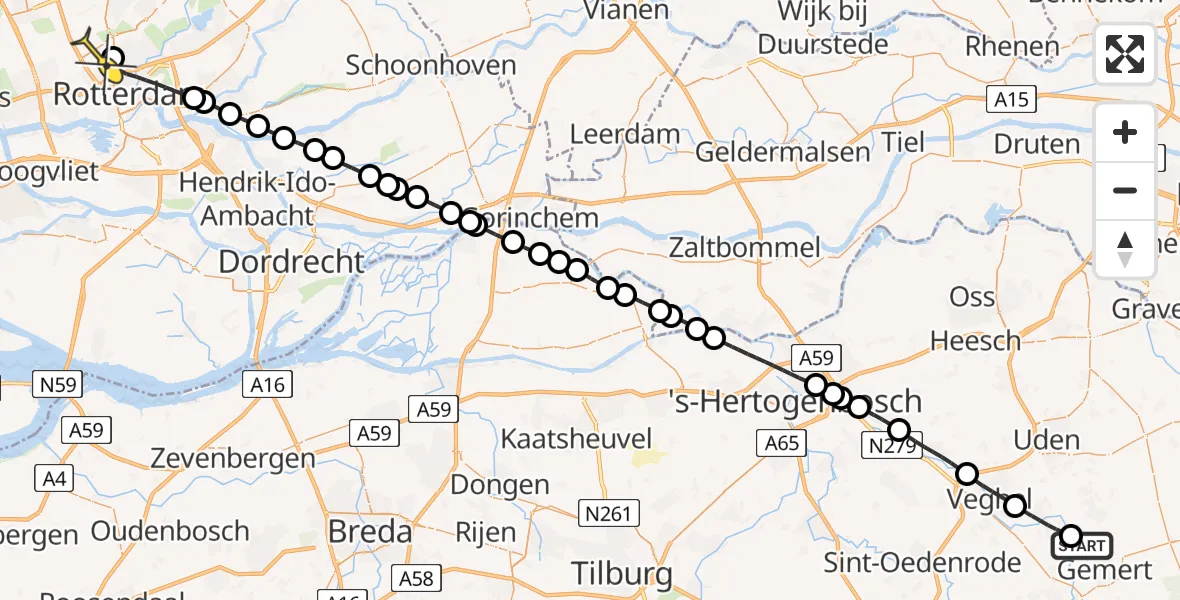 Op donderdag 26 juni 2025 om 20:50 is er een Traumahelikopter vertrokken van Gemert naar Rotterdam The Hague Airport. Het gaat om de Traumahelikopter met registratienummer PH-HVB. De vlucht duurde 30 minuten. Het toestel heeft in die periode 94 kilometer afgelegd met een gemiddelde snelheid van 188 kilometer per uur op een maximale vlieghoogte van 335 meter.