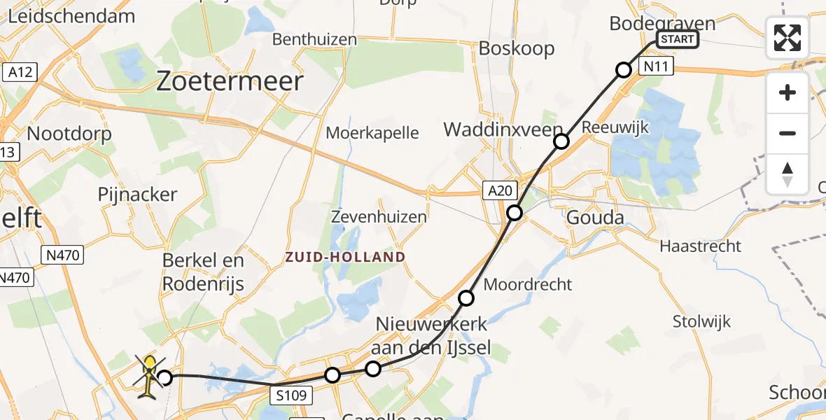 Op dinsdag 8 juli 2025 om 18:09 is er een Traumahelikopter vertrokken van Bodegraven naar Rotterdam The Hague Airport. Het gaat om de Traumahelikopter met registratienummer PH-MAA. De vlucht duurde 10 minuten. Het toestel heeft in die periode 29 kilometer afgelegd met een gemiddelde snelheid van 169 kilometer per uur op een maximale vlieghoogte van 290 meter.