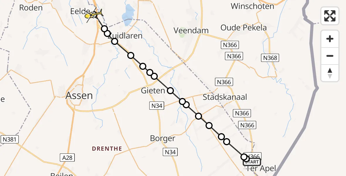 Op woensdag 9 juli 2025 om 21:36 is er een Traumahelikopter vertrokken van Ter Apel naar Eelde. Het gaat om de Traumahelikopter met registratienummer PH-TTR. De vlucht duurde 12 minuten. Het toestel heeft in die periode 40 kilometer afgelegd met een gemiddelde snelheid van 205 kilometer per uur op een maximale vlieghoogte van 549 meter.