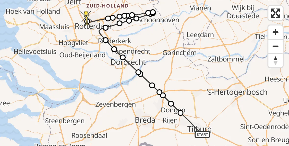 Op donderdag 10 juli 2025 om 18:54 is er een Traumahelikopter vertrokken van Tilburg naar Rotterdam The Hague Airport. Het gaat om de Traumahelikopter met registratienummer PH-MAA. De vlucht duurde 31 minuten. Het toestel heeft in die periode 109 kilometer afgelegd met een gemiddelde snelheid van 209 kilometer per uur op een maximale vlieghoogte van 838 meter.
