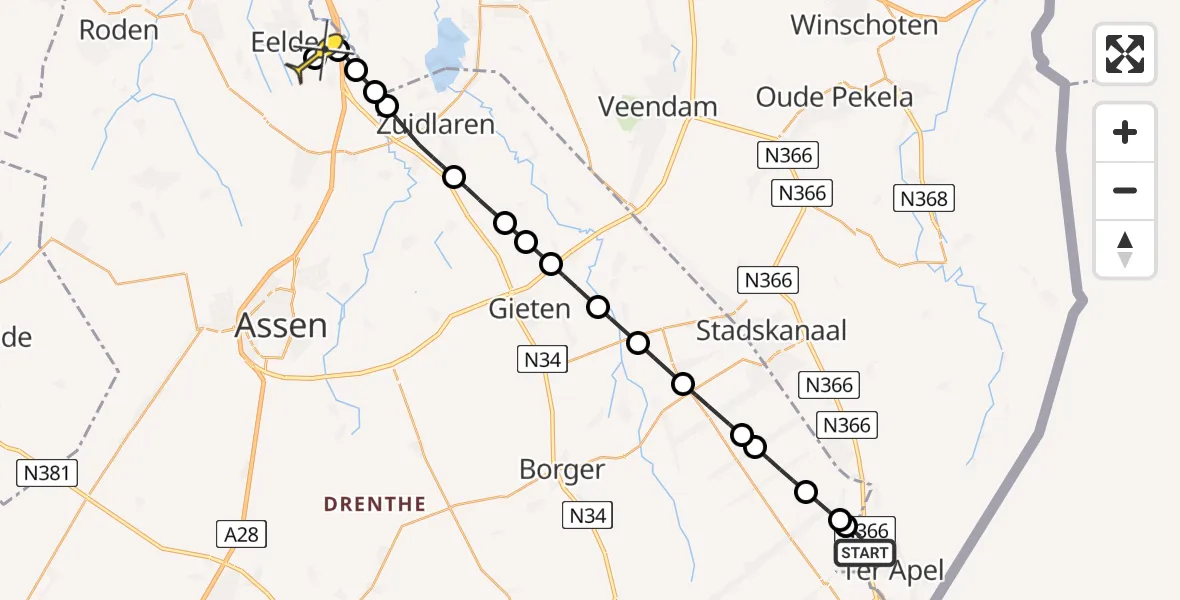 Op zaterdag 12 juli 2025 om 16:15 is er een Traumahelikopter vertrokken van Ter Apel naar Groningen Airport Eelde. Het gaat om de Traumahelikopter met registratienummer PH-DOC. De vlucht duurde 15 minuten. Het toestel heeft in die periode 42 kilometer afgelegd met een gemiddelde snelheid van 162 kilometer per uur op een maximale vlieghoogte van 320 meter.