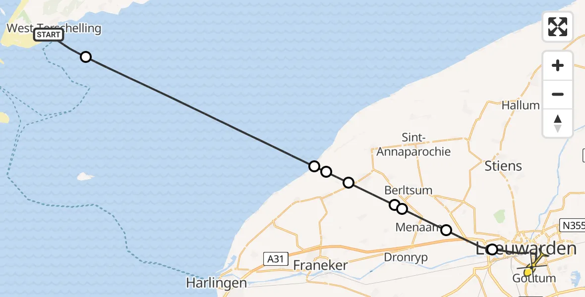 Op maandag 14 juli 2025 om 8:09 is er een Ambulancehelikopter vertrokken van West-Terschelling naar Leeuwarden. Het gaat om de Ambulancehelikopter met registratienummer PH-OOP. De vlucht duurde 13 minuten. Het toestel heeft in die periode 45 kilometer afgelegd met een gemiddelde snelheid van 202 kilometer per uur op een maximale vlieghoogte van 312 meter.