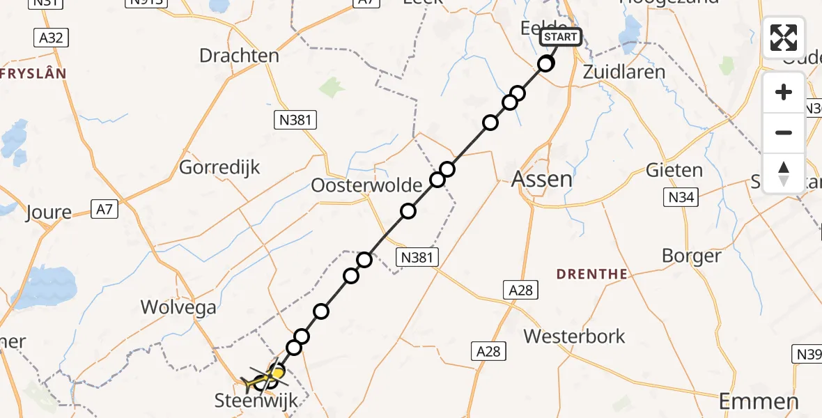 Op dinsdag 15 juli 2025 om 13:16 is er een Traumahelikopter vertrokken van Groningen Airport Eelde naar Eesveen. Het gaat om de Traumahelikopter met registratienummer PH-DOC. De vlucht duurde 14 minuten. Het toestel heeft in die periode 48 kilometer afgelegd met een gemiddelde snelheid van 213 kilometer per uur op een maximale vlieghoogte van 137 meter.