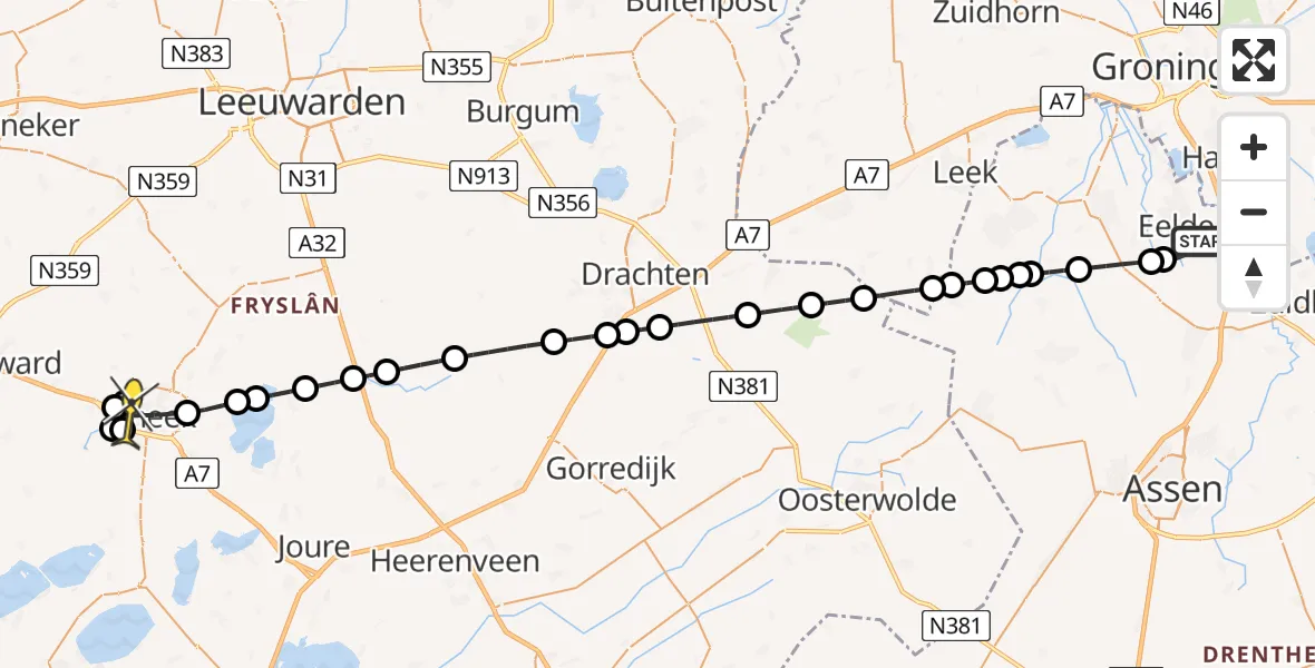 Op woensdag 16 juli 2025 om 20:23 is er een Traumahelikopter vertrokken van Groningen Airport Eelde naar Sneek. Het gaat om de Traumahelikopter met registratienummer PH-DOC. De vlucht duurde 21 minuten. Het toestel heeft in die periode 72 kilometer afgelegd met een gemiddelde snelheid van 211 kilometer per uur op een maximale vlieghoogte van 305 meter.