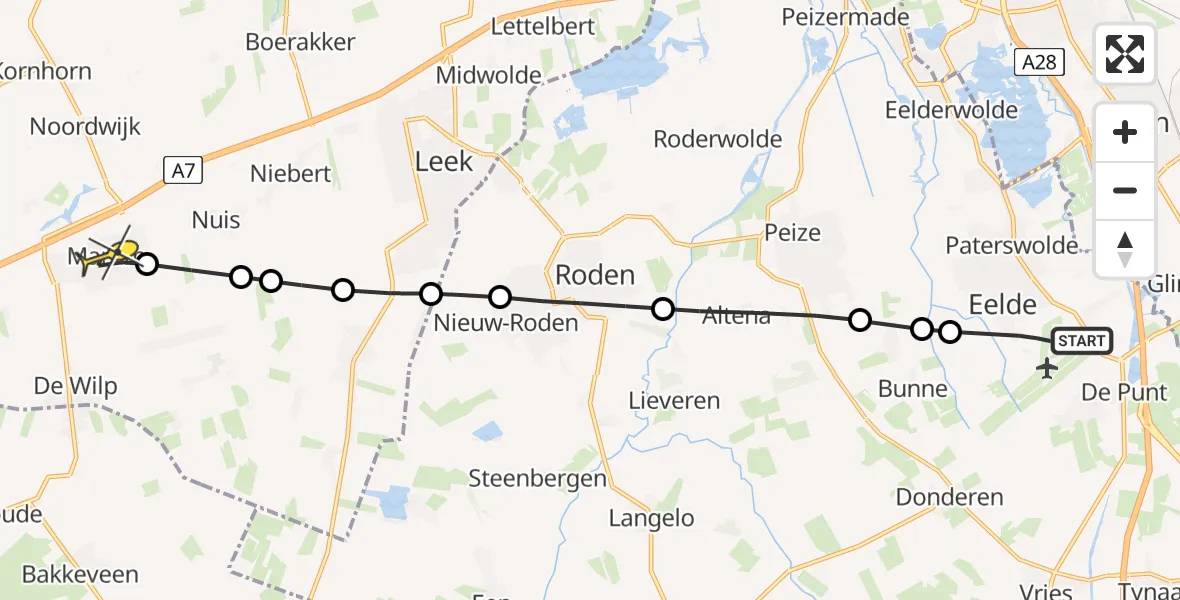 Op vrijdag 25 juli 2025 om 11:33 is er een Traumahelikopter vertrokken van Groningen Airport Eelde naar Marum. Het gaat om de Traumahelikopter met registratienummer PH-DOC. De vlucht duurde 9 minuten. Het toestel heeft in die periode 22 kilometer afgelegd met een gemiddelde snelheid van 155 kilometer per uur op een maximale vlieghoogte van 114 meter.