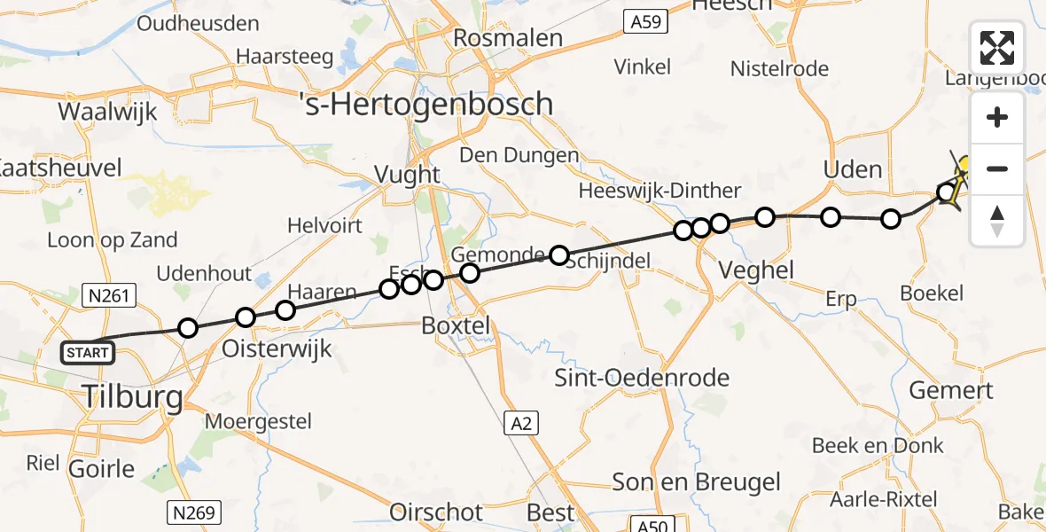 Op zondag 27 juli 2025 om 12:58 is er een Traumahelikopter vertrokken van Tilburg naar Vliegbasis Volkel. Het gaat om de Traumahelikopter met registratienummer PH-LLN. De vlucht duurde 12 minuten. Het toestel heeft in die periode 45 kilometer afgelegd met een gemiddelde snelheid van 220 kilometer per uur op een maximale vlieghoogte van 305 meter.
