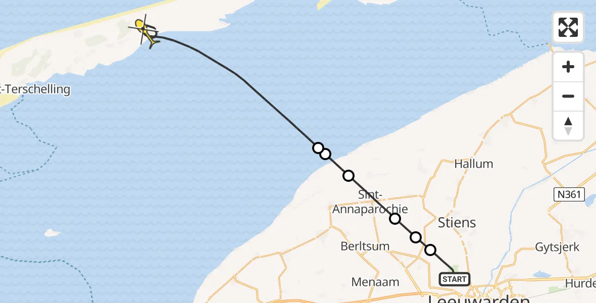 Op zondag 27 juli 2025 om 16:00 is er een Ambulancehelikopter vertrokken van Vliegbasis Leeuwarden naar Oosterend. Het gaat om de Ambulancehelikopter met registratienummer PH-OOP. De vlucht duurde 14 minuten. Het toestel heeft in die periode 37 kilometer afgelegd met een gemiddelde snelheid van 165 kilometer per uur op een maximale vlieghoogte van 366 meter.