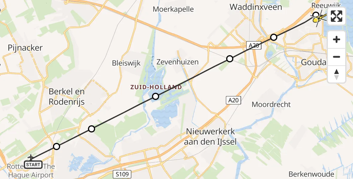 Op woensdag 30 juli 2025 om 11:50 is er een Traumahelikopter vertrokken van Rotterdam The Hague Airport naar Reeuwijk. Het gaat om de Traumahelikopter met registratienummer PH-UMC. De vlucht duurde 7 minuten. Het toestel heeft in die periode 22 kilometer afgelegd met een gemiddelde snelheid van 183 kilometer per uur op een maximale vlieghoogte van 244 meter.