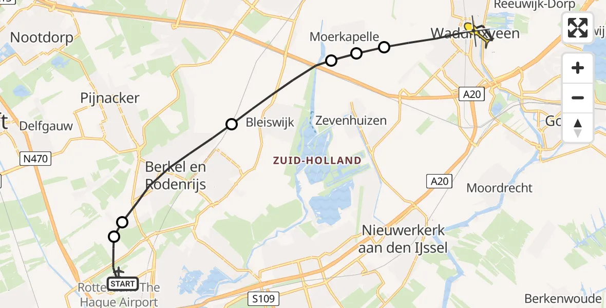 Op vrijdag 1 augustus 2025 om 16:00 is er een Traumahelikopter vertrokken van Rotterdam The Hague Airport naar Waddinxveen. Het gaat om de Traumahelikopter met registratienummer PH-HVB. De vlucht duurde 16 minuten. Het toestel heeft in die periode 22 kilometer afgelegd met een gemiddelde snelheid van 84 kilometer per uur op een maximale vlieghoogte van 244 meter.